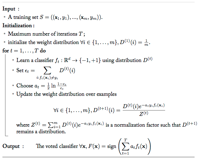 This program is an implementation of the Adaptive Boosting (AdaBoost) algorithm proposed by [Schapire, 1999; Freund, 1995] and described in [Amini, 2015; p.88-97]. This algorithm generates a set of weak binary learners and combine them using a voting method; the t-th weak classier takes into account the errors committed by the previous weak classifier. This is done by affecting a weight D(i), to each training example i : a well (resp. misclassified) example by the previous classifier will get a lower (resp. higher) weight. A new training set is then sampled from the initial training set with respect to these weights and a new classifier is trained. By doing so, the new classifier focusses then on hard examples found by the previous classifier. The final classifier called the boosted, or the voted, classifier is a linear combination of the weak-classifiers where the combination weights depend on the misclassification error of the associated classifiers. The pseudo-code of the algorithm is: